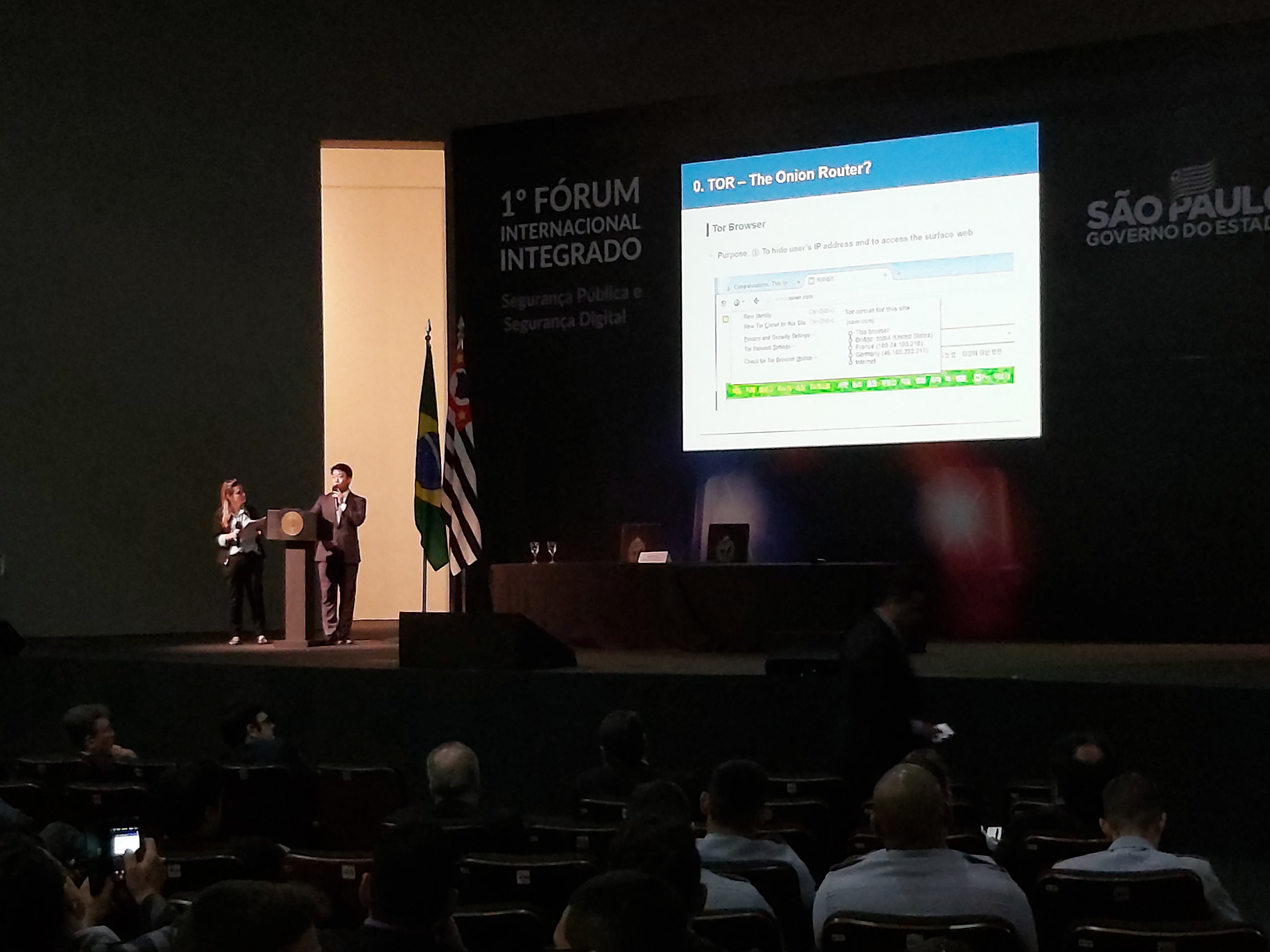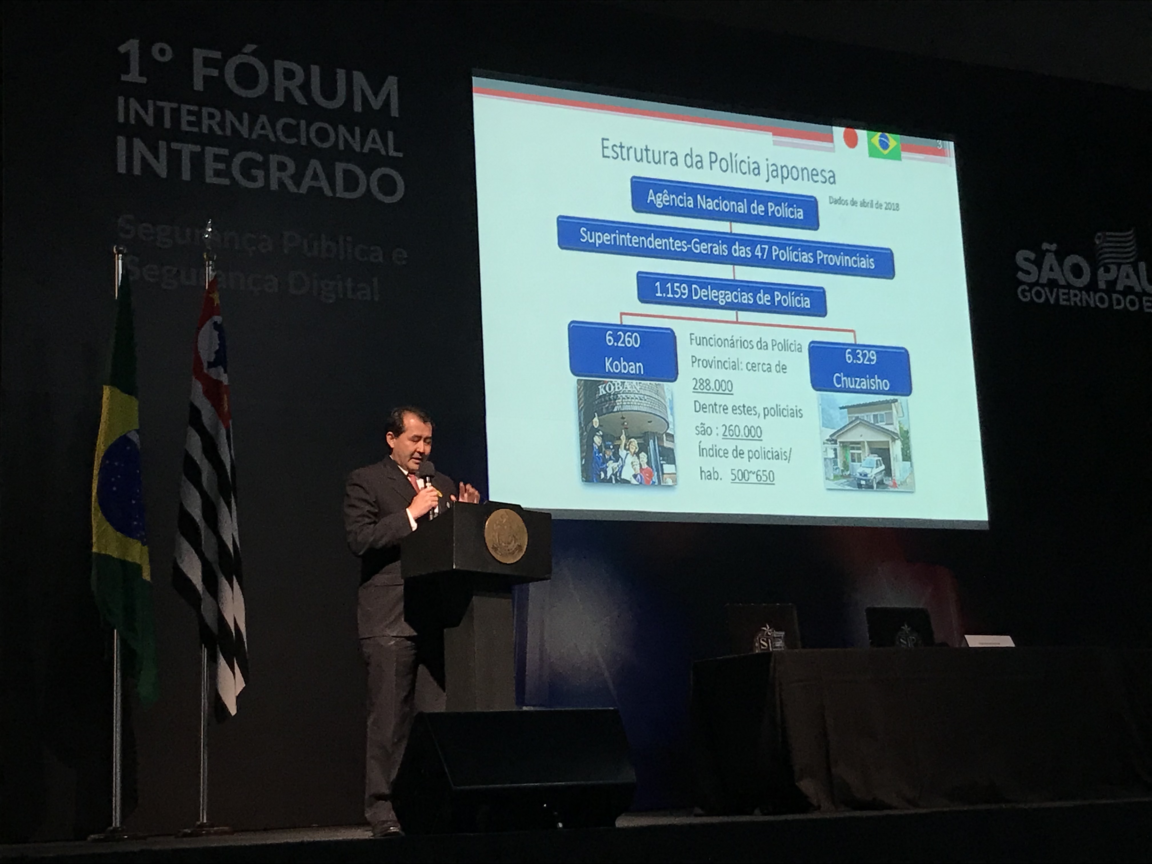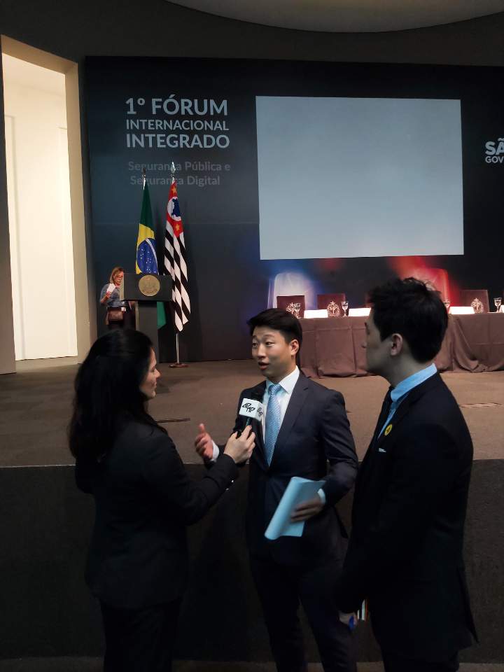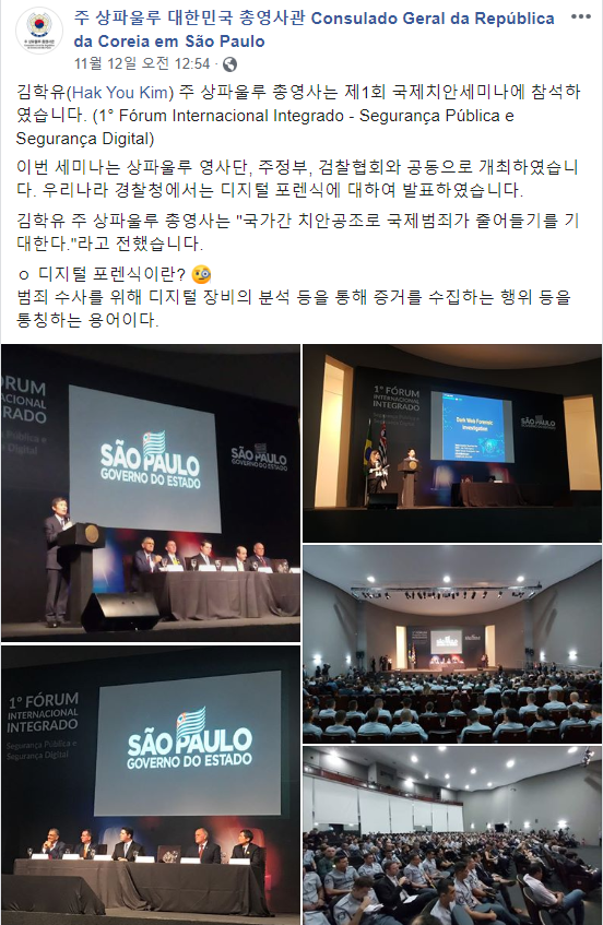 1° Fórum Internacional Integrado - Segurança Pública e Segurança Digital no Palácio do Estado de São Paulo. Um inspetor da Polícia Nacional da Coreia veio ao Brasil para apresentar a forensic digital do país no fórum. Agradeço à Associação do Ministério Público, à Secretaria da Segurança Pública e à Secretaria de Relações Internacionais do Estado de São Paulo pela organização do evento tão importante. Espero que o evento contribua para fortalecer cooperações de investigação científica entre nações e diminuir crimilidade mundial.