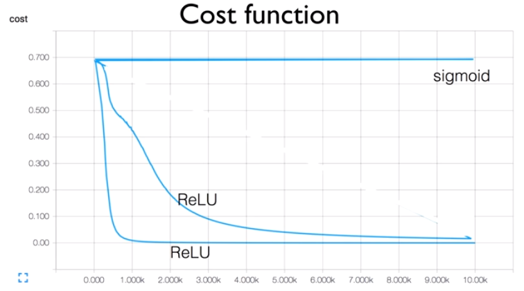 - Vanishing Gradient : 이러한 hidden layer를 2, 3단이 아니라 9, 10단까지 늘릴 경우, 오히려 정확도가 0.5 밖에 되지 않는 문제 발생 : sigmoid 함수가 0~1 사이의 값이므로 이를 9, 10단만큼 곱해지는 경우 거의 0에 수렴하는 작은 값이 되어버림.