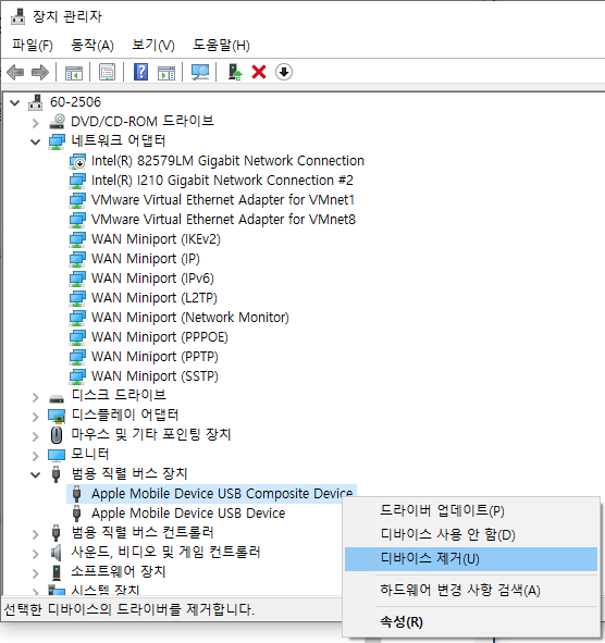 제어판 - 장치 관리자 - 범용 직렬 버스 장치 - Apple Mobile Device USB Composite Device 제거 - 컴퓨터 재시작