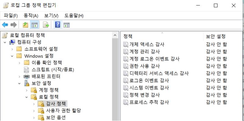- GPEDIT.MSC → [컴퓨터구성] → [Windows 설정] → [보안설정] → [로컬정책] → [감사정책]