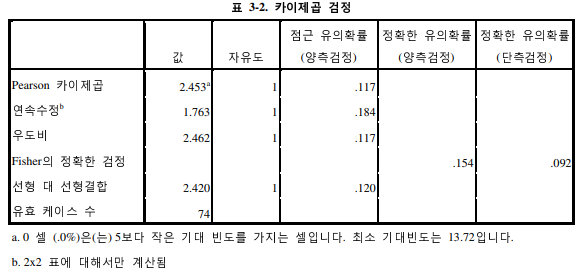 <표 3-2>는 카이스퀘어 검정 결과이다. 카이스퀘어 값은 2.453임을 알 수 있다. 이는