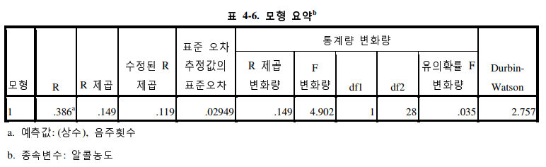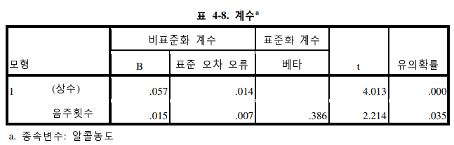 다음으로 회귀모형이 통계적으로 적합한지에 대한 검정을 하는 것으로 ANOVA 분석을 하여 그 결과가 유의미하면 적합하다고 판단한다. 여기에서는 F값이 4.902 이고 P값(sig값이 0.035)이 0.1보다 낮기 때문에 이 회귀모형이 적합하다고 판단하 여 그대로 사용할 수 있다.