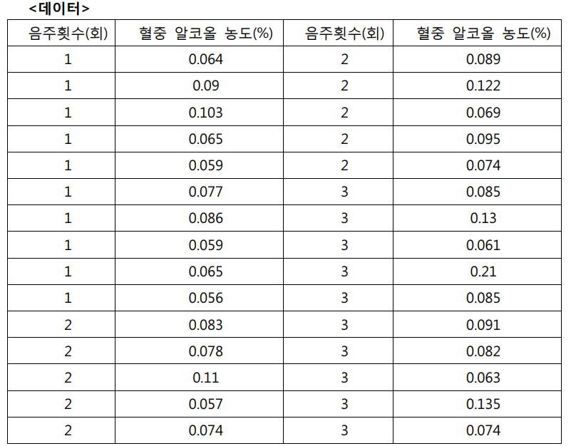 종속변수인 혈중 알코올 농도(%)에 영향을 미치는 독립변수는 음주횟수(회) 1개이므로, 일원 분산 분석(one-way ANOVA)을 통 해 각 집단에 따라 혈중 알코올 농도의 차이가 있는지 알아보겠다.