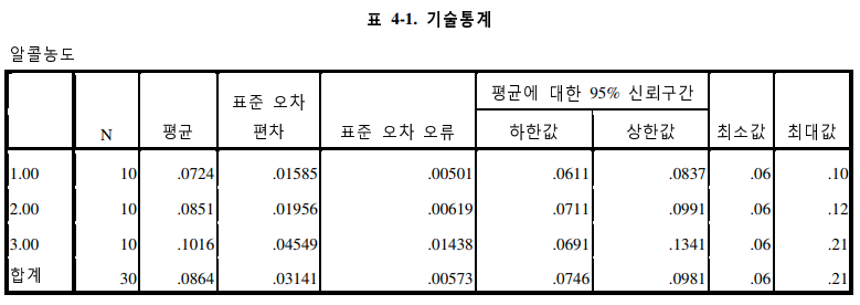아래의 <표 4-1>은 기술통계량으로서 음주운전횟수 1,2,3별 표본 개수, 평균, 표준 편차, 평균에 대한 95% 신뢰 구간 등의 정보를 알 수 있다.