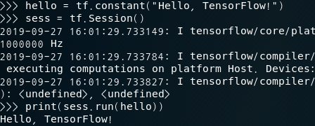 # start a TF session // 다른 프로그래밍 언어와 달리, 명령어 실행을 하려면 Session 생성이 필요